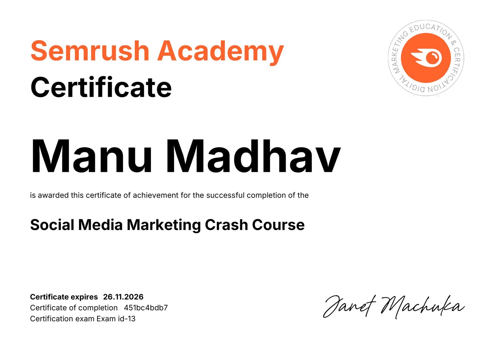 I’m Manu Madhav, an aspiring digital marketing executive from Palakkad, Kerala, who completed 12th in commerce and B.Com in Computer Applications, and after gaining experience in a client-facing marketing role, to becoming the best digital marketer in Palakkad